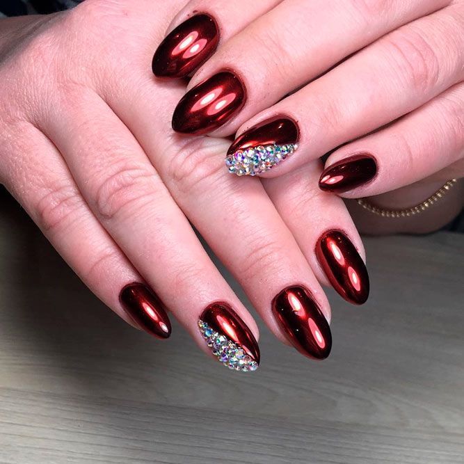 Nothing says glam like rhinestones. Accent a few nails with crystal embellishments to elevate your burgundy chrome manicure. You can create a simple cluster near the cuticle or a full-blown rhinestone design for a high-fashion look. It’s your nails’ time to shine!